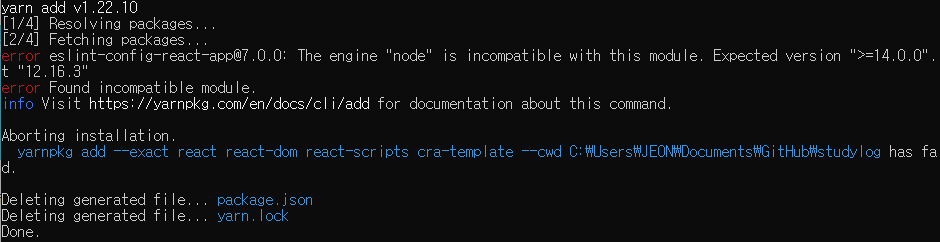 create-react-app 을 생성하려 했더니 해당 오류가 떴다.